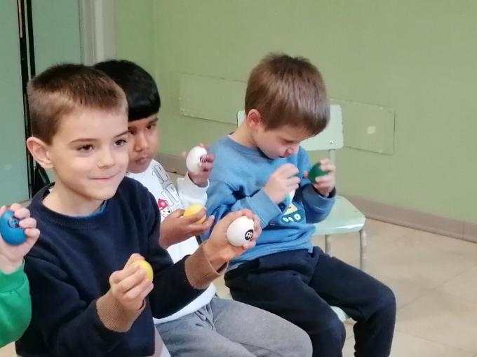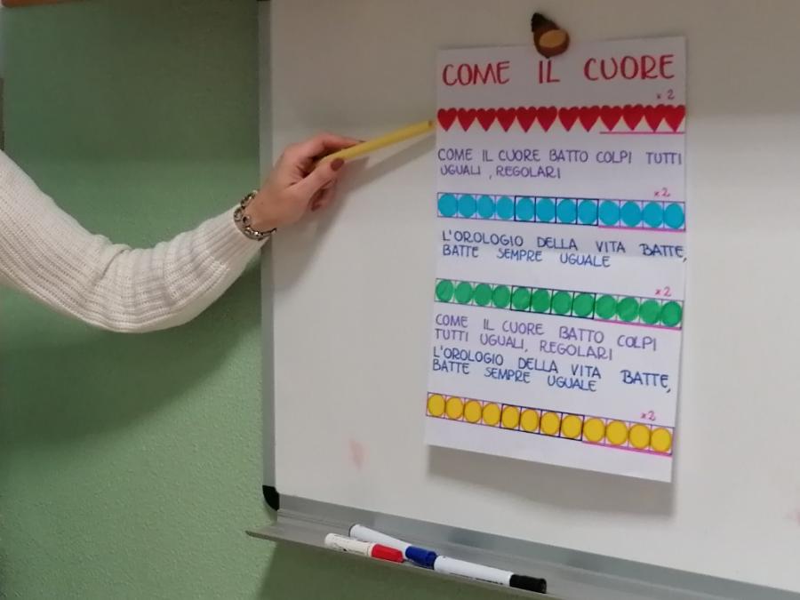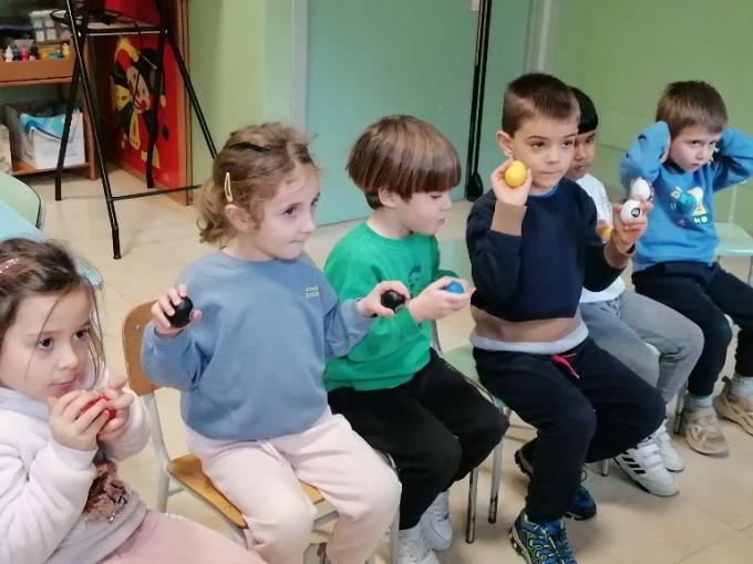 Abbiamo iniziato la nostra avventura con un approccio ludico alla lettura musicale, utilizzando uno spartito non convenzionale fatto di grandi pallini colorati. I bambini si sono divertiti a interpretare questi colori attraverso la Body Percussion, associando con entusiasmo l’azzurro al battito delle mani, il verde al battito sulle gambe e il giallo al battito dei piedi. È stato un bellissimo gioco di coordinazione che poi si è spostato dal corpo agli strumenti: lo stesso ritmo è stato infatti portato sui legnetti per i suoni secchi e sugli ovetti shaker per i suoni più morbidi.