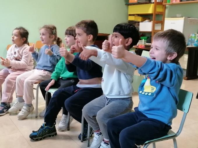 Dalla precisione del ritmo siamo poi passati alla creatività della voce, unendo il movimento al canto in modo spontaneo e coinvolgente. Per questa attività, i bambini hanno seguito uno spartito illustrato preparato dalla Maestra Silvia Pighi, che li ha invitati a interpretare una canzone fatta di gesti e suoni onomatopeici. È stato emozionante vederli dare vita alle immagini: dal goloso “Gnam gnam” del mangiare al fresco “Glu glu” del bere, passando per i suoni della quotidianità come il “Drin drin” del campanello o il “Toc toc” alla porta, fino ad arrivare a un festoso “Yeah” finale con tanto di gesto della mano.