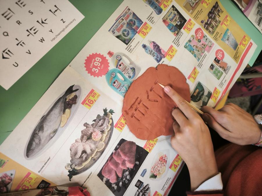 Successivamente, gli alunni hanno indossato i panni di piccoli scribi: la classe si è trasformata in una edubba sumera, la scuola degli scribi, e ogni bambino ha avuto l’opportunità di cimentarsi con argilla e DAS. Accompagnati dall’alfabeto cuneiforme sumerico, gli alunni hanno modellato una piccola tavoletta e inciso su di essa il proprio nome, osservando attentamente la forma dei segni e la tecnica di incisione. Gli alunni hanno compreso così come gli scribi sumero-antichi comunicavano informazioni e registravano dati importanti attraverso simboli incisi su argilla.
