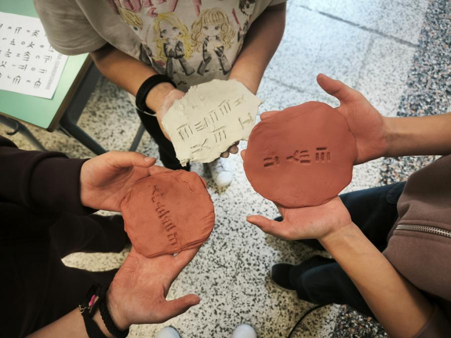 L’attività è iniziata con la visione di un filmato che raccontava e approfondiva la scrittura cuneiforme, già studiata in classe nei giorni precedenti. Questo ha permesso agli alunni di richiamare le conoscenze pregresse e osservare da vicino come gli scribi sumeri incidevano i segni sull’argilla.