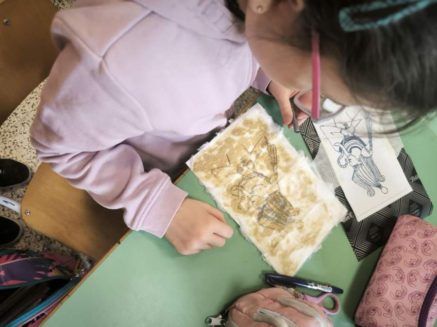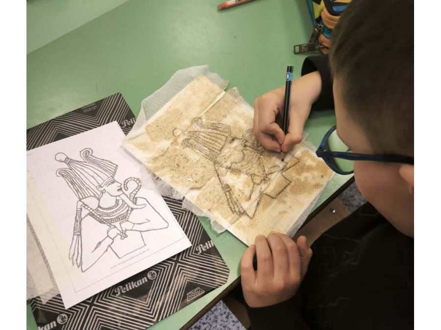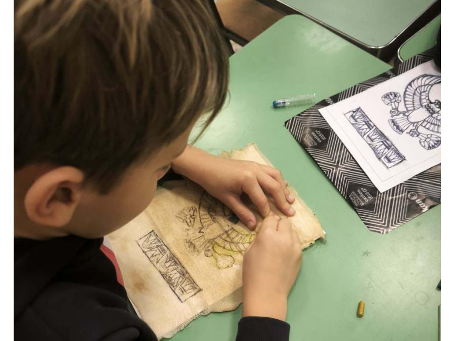 L’attività laboratoriale si è articolata in due momenti. Nella prima fase gli alunni hanno realizzato il proprio papiro utilizzando garze e una miscela di colla vinilica, caffè e acqua, sperimentando in modo pratico materiali e tecniche per ottenere un supporto simile a quello antico. Dopo il tempo necessario per l’asciugatura, nella seconda fase del laboratorio gli alunni hanno utilizzato la carta carbone per ricalcare sul papiro alcune immagini raffiguranti divinità, animali sacri e faraoni. Le immagini sono state successivamente colorate con i pastelli a cera, richiamando i colori tipici dell’arte egizia.