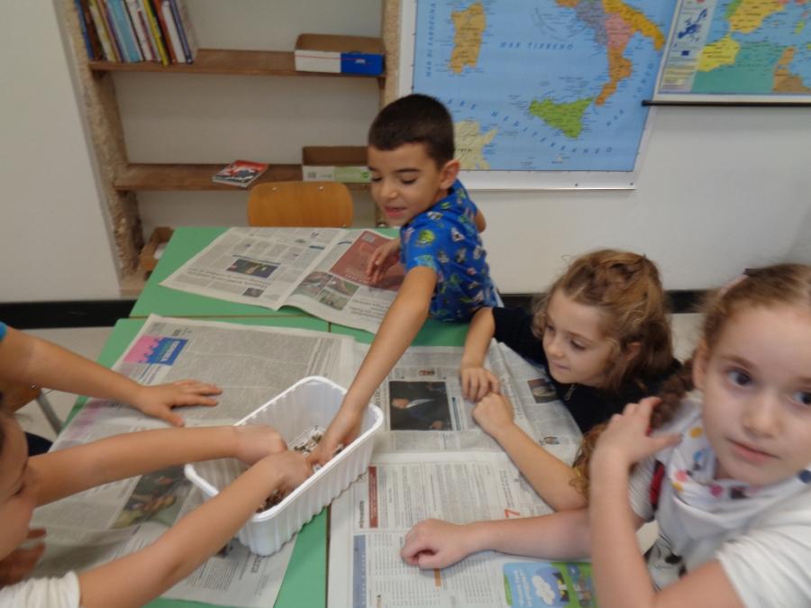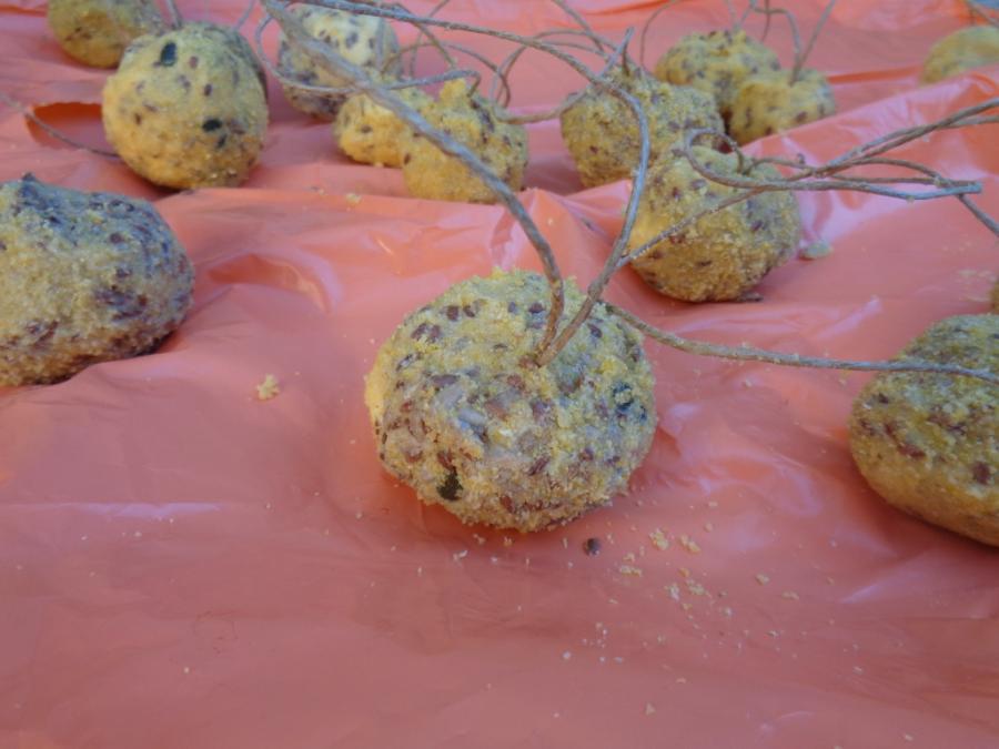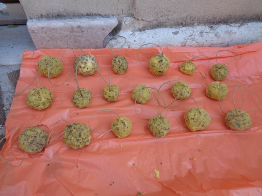 In occasione dell’arrivo del freddo e visitando spesso l’orto ci siamo accorti che gli uccellini cercavano cibo infreddoliti. Così, dopo aver consultato qualche sito web che si occupa di tutela dell’ambiente, con avanzi di pane secco, semi di lino, zucca, girasole e briciole abbiamo preparato delle palline amalgamandole con della margarina e mettendole a raffreddare fuori all’aperto. Poi le abbiamo appese sui rami degli alberi dell’orto e, con grande stupore, qualche giorno dopo non ce n’era più traccia. Abbiamo capito che si possono conservare gli avanzi di pane, le briciole o i semini per poter pensare anche agli uccellini nei freddi mesi invernali. Lavorare in gruppo per preparare queste palline è stato un bel modo per collaborare insieme e creare qualcosa di buono e utile!