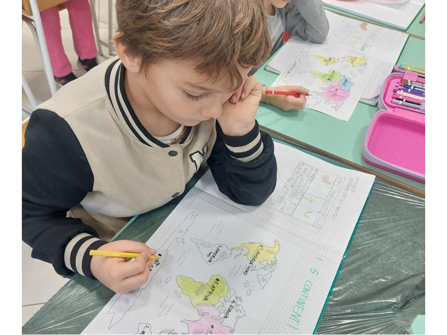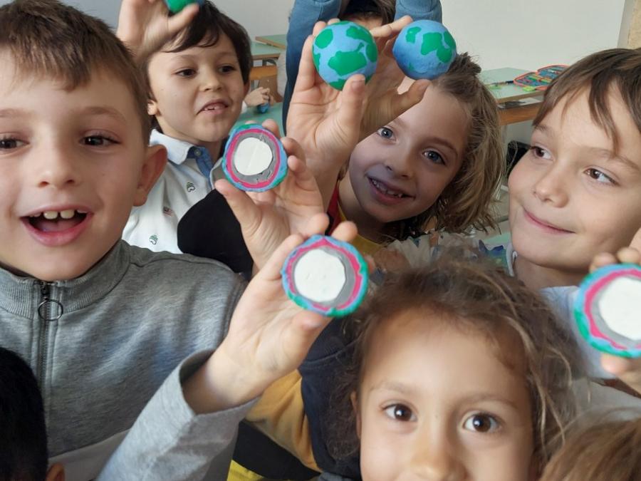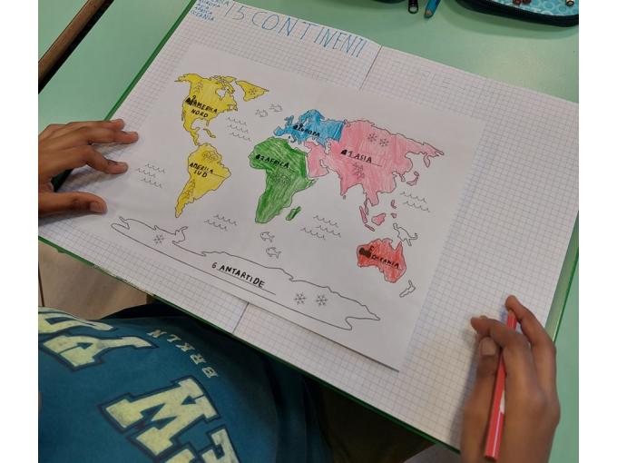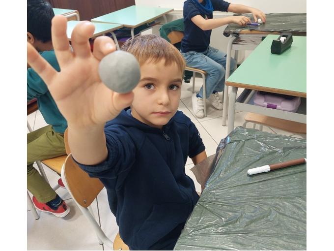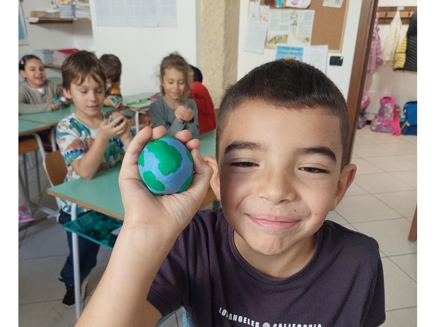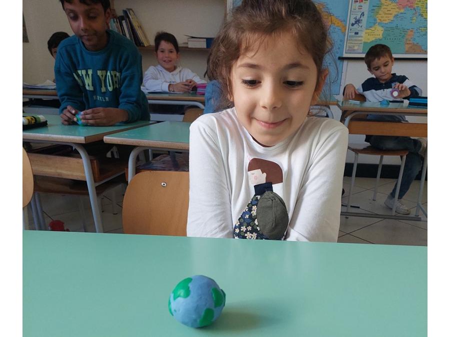 Nell’ambito della disciplina di geografia ed educazione alla cittadinanza abbiamo voluto lavorare prima che sul micro ( montagne, colline, pianure, mari, fiumi…), sul MACRO per sviluppare e potenziare la consapevolezza rispetto al nostro pianeta, inserito nel sistema solare che ha delle caratteristiche precise. E’ importante sapere come è fatto il nostro pianeta sotto i nostri piedi, oltre la crosta continentale e oceanica, perché aumenta il grado di consapevolezza e di realtà rispetto a ciò che non è visibile. Abbiamo costruito un globo con la plastilina con tutti i suoi strati, dal nucleo interno a quello esterno, al mantello fino alla crosta (oceanica e continentale). Il lavoro è stato preceduto da un’analisi dei continenti, colorati in base alla loro estensione e degli oceani e dei mari.