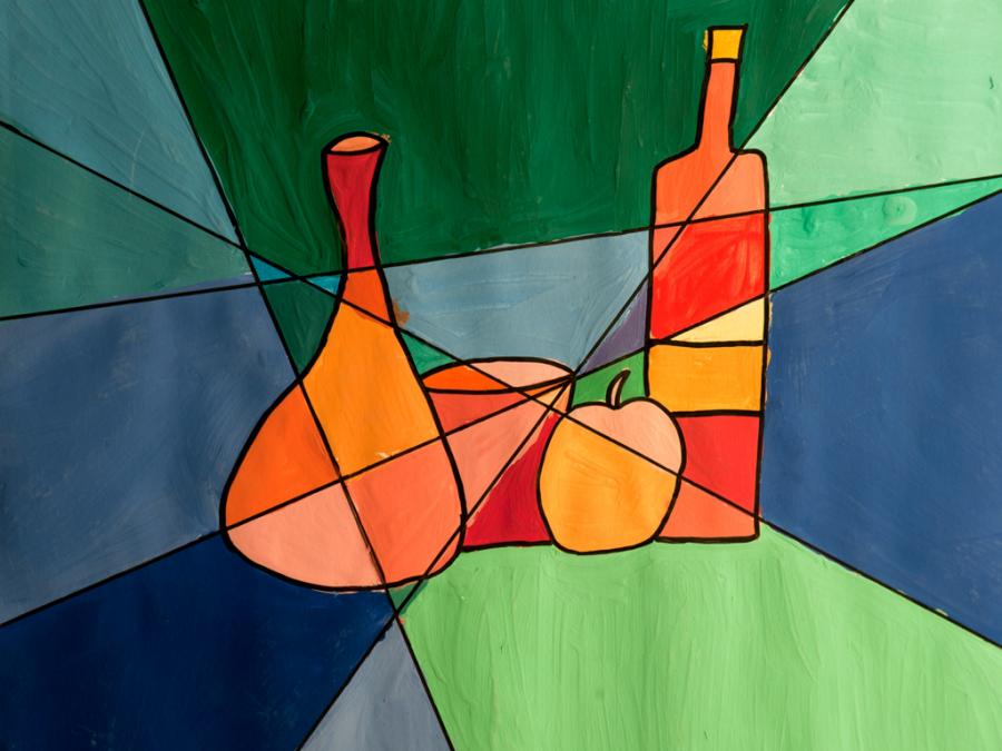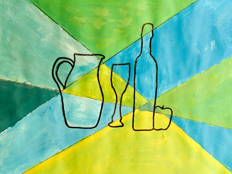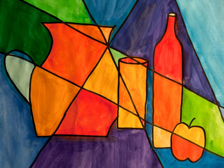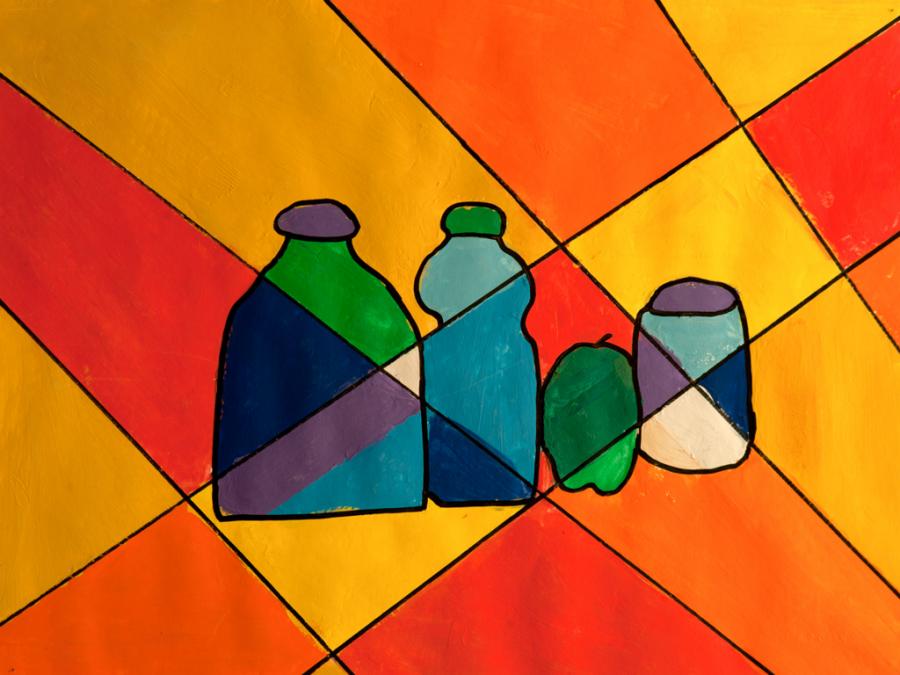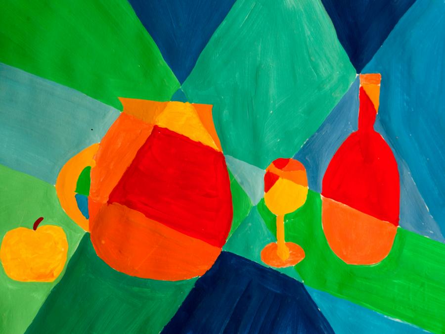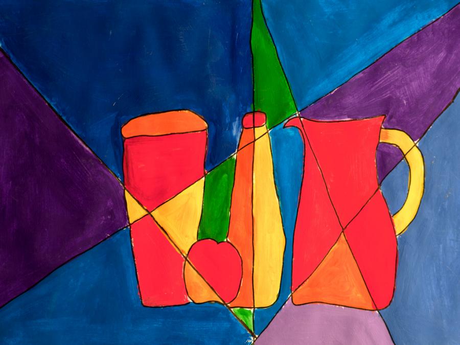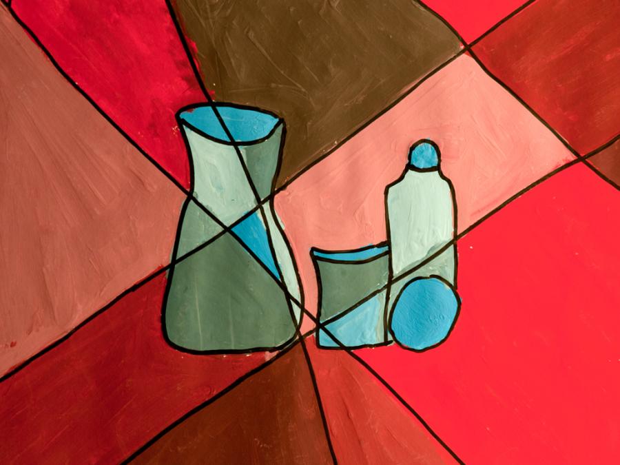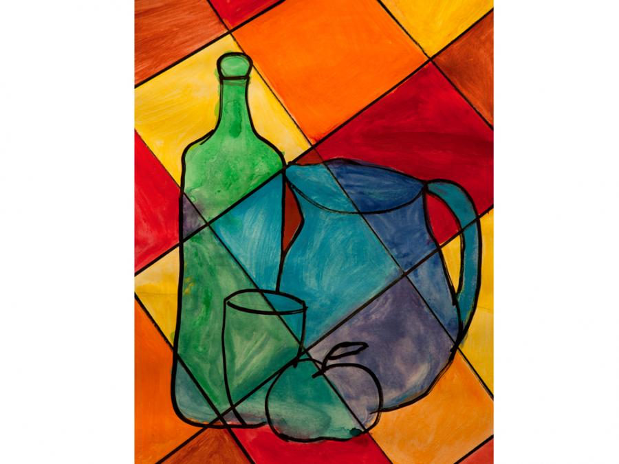 Avendo studiato i colori caldi e freddi gli studenti hanno dipinto una natura morta con i colori a tempera. Inizialmente è stato eseguito un disegno a mano libera di quattro oggetti: una caraffa, una bottiglia, un bicchiere e una mela, disposti realmente su un tavolo e copiati sul foglio facendo attenzione alla composizione. Successivamente sono state tracciate cinque o sei linee con il righello con andamento diagonale che hanno intersecato la composizione degli oggetti creando degli spazi che sono stati colorati con i colori a tempera, a campiture piatte, cioè stendendo il colore in modo uniforme e senza sfumature, seguendo il seguente criterio: lo sfondo con colori caldi, gli oggetti con colori freddi, oppure il contrario. I contorni sono stati poi ripassati con il pennarello nero indelebile a punta grossa.