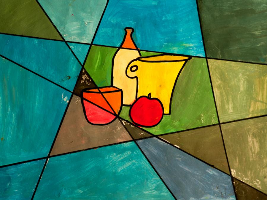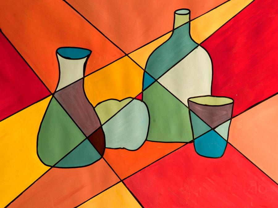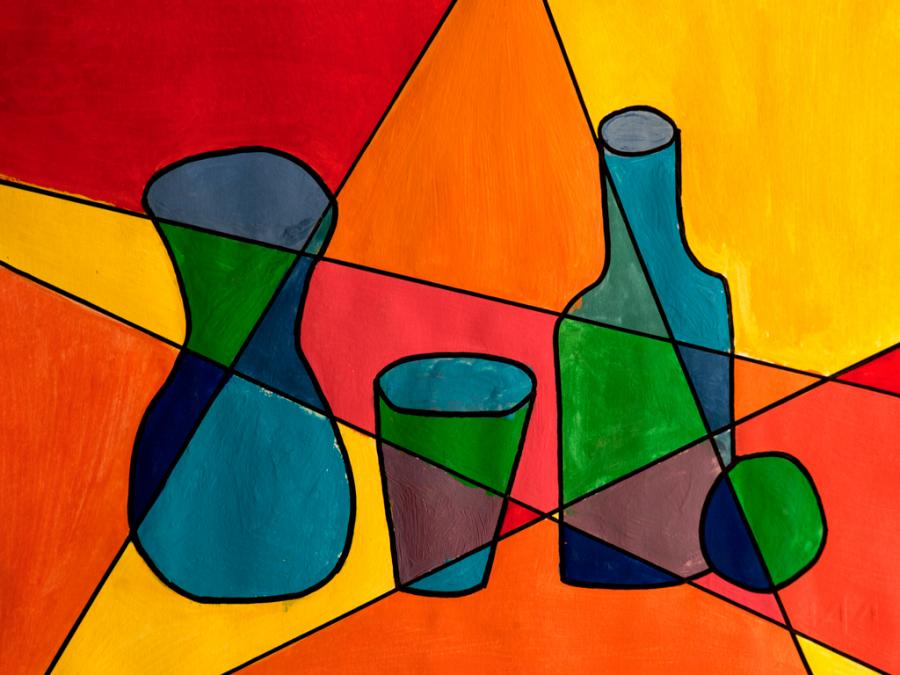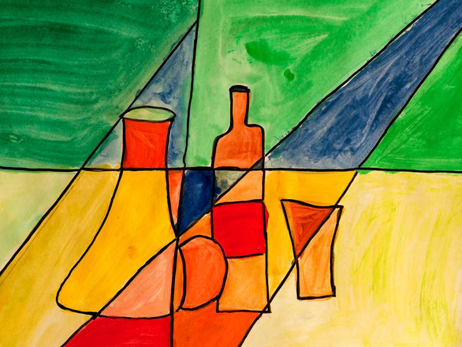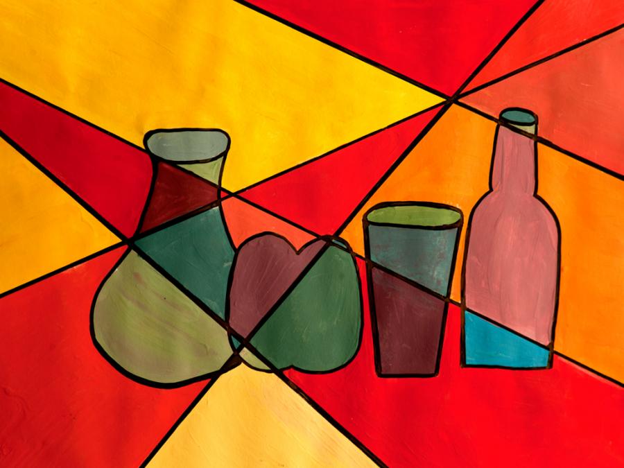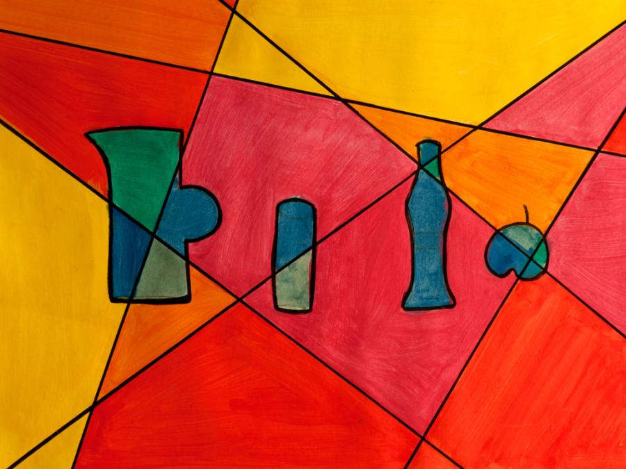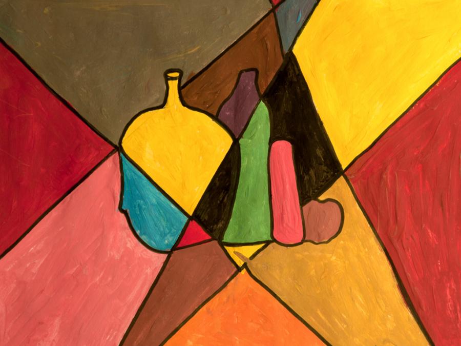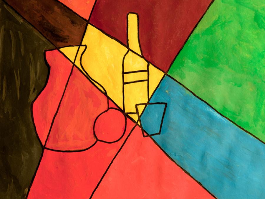 Avendo studiato i colori caldi e freddi gli studenti hanno dipinto una natura morta con i colori a tempera. Inizialmente è stato eseguito un disegno a mano libera di quattro oggetti: una caraffa, una bottiglia, un bicchiere e una mela, disposti realmente su un tavolo e copiati sul foglio facendo attenzione alla composizione. Successivamente sono state tracciate cinque o sei linee con il righello con andamento diagonale che hanno intersecato la composizione degli oggetti creando degli spazi che sono stati colorati con i colori a tempera, a campiture piatte, cioè stendendo il colore in modo uniforme e senza sfumature, seguendo il seguente criterio: lo sfondo con colori caldi, gli oggetti con colori freddi, oppure il contrario. I contorni sono stati poi ripassati con il pennarello nero indelebile a punta grossa.