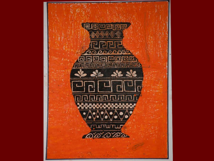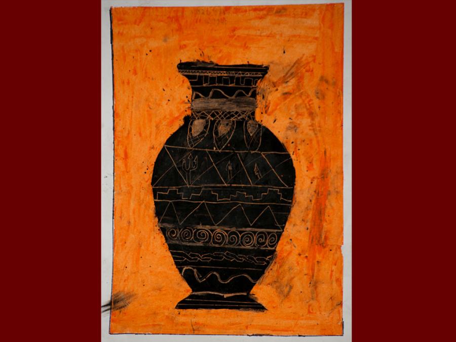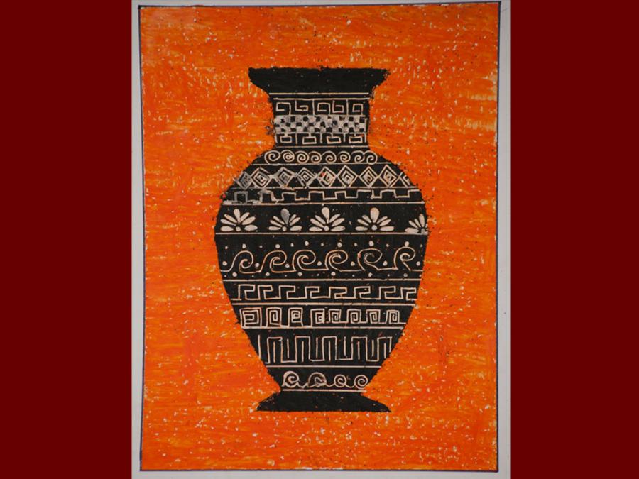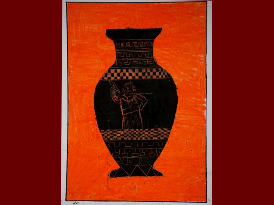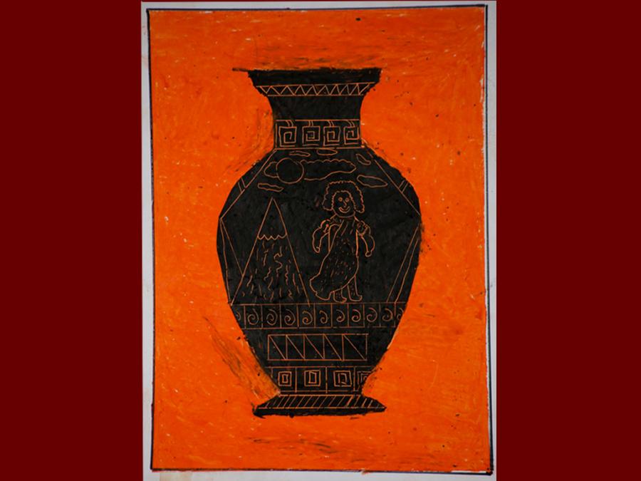 Dallo studio della pittura vascolare greca sono stati eseguiti degli elaborati utilizzando i pastelli a cera. Sovrapponendo tre diverse stratificazioni di colore che iniziano dal giallo, poi l’arancione ed infine il nero, si è proseguito con la decorazione del vaso mediante ‘graffiatura’ utilizzando la punta di uno stuzzicadenti per scoprire le tinte sottostanti.