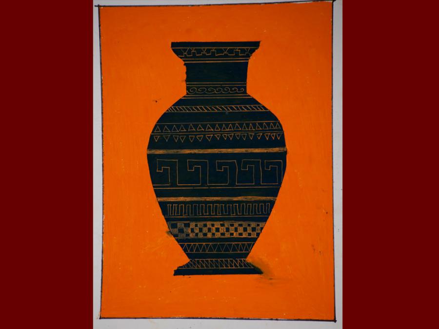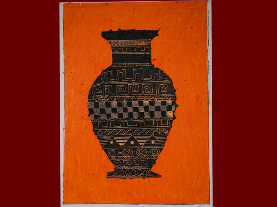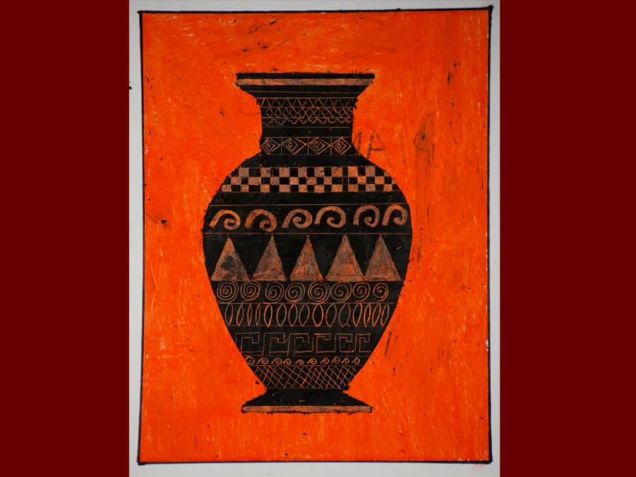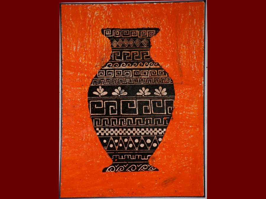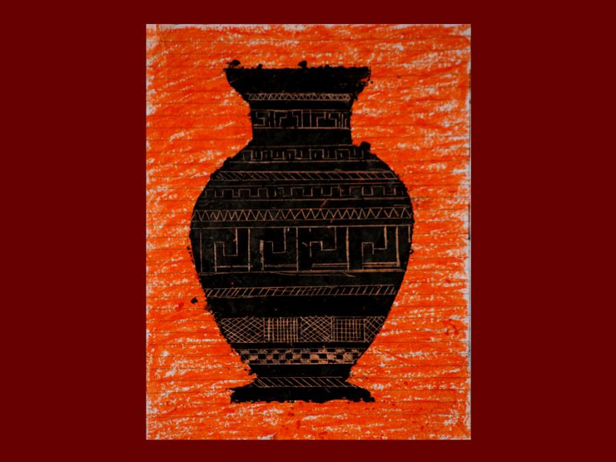 Dallo studio della pittura vascolare greca sono stati eseguiti degli elaborati utilizzando i pastelli a cera. Sovrapponendo tre diverse stratificazioni di colore che iniziano dal giallo, poi l’arancione ed infine il nero, si è proseguito con la decorazione del vaso mediante ‘graffiatura’ utilizzando la punta di uno stuzzicadenti per scoprire le tinte sottostanti.